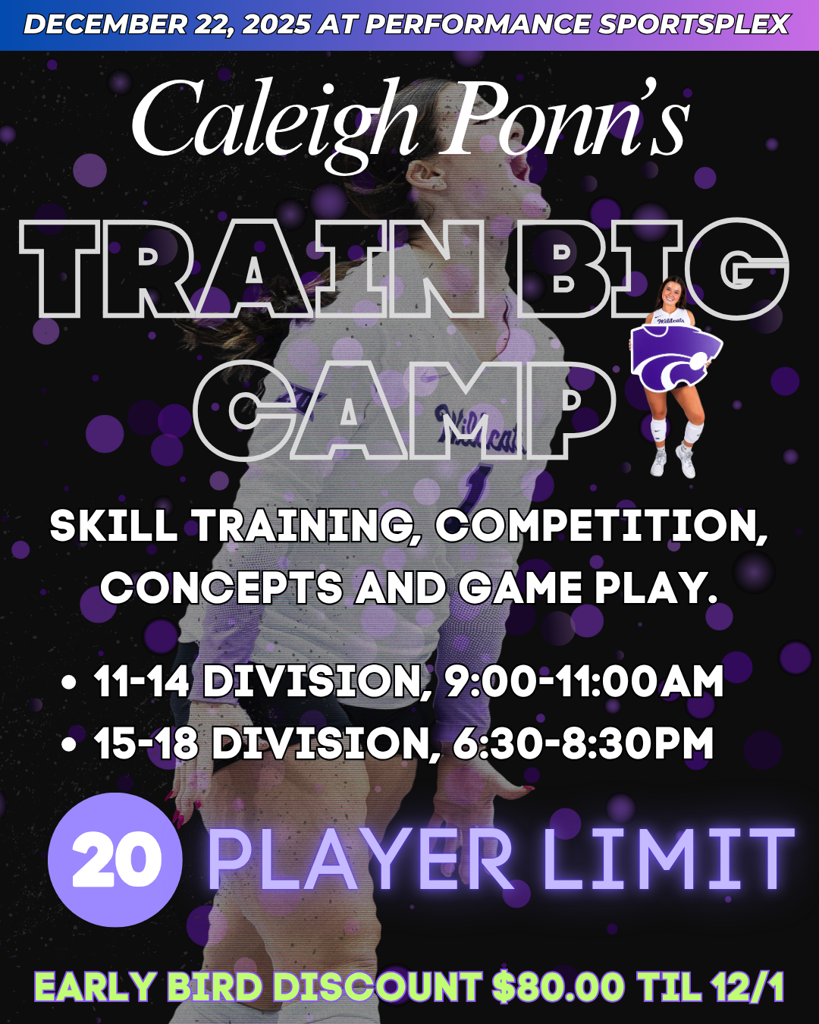 Train with Division I volleyball standout Caleigh Ponn from Kansas State University at this high-energy skills camp! Players will work directly with Caleigh on serving, passing, setting, attacking, and game IQ through drills, competitions, and constructive feedback